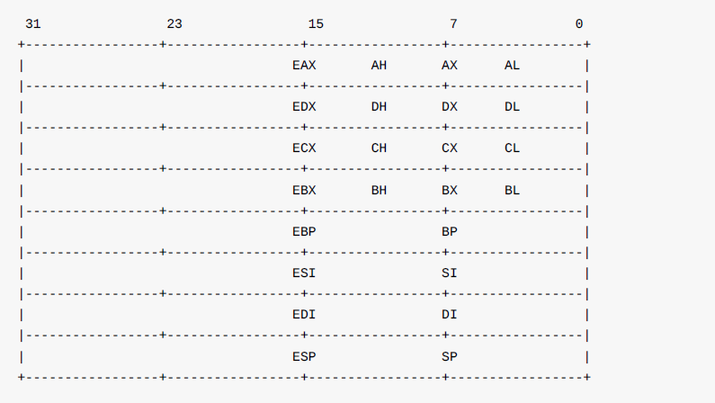 9 uint32_t eax, ecx, edx, ebx, esp, ebp, esi, edi;