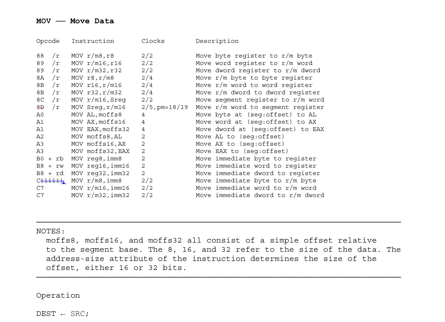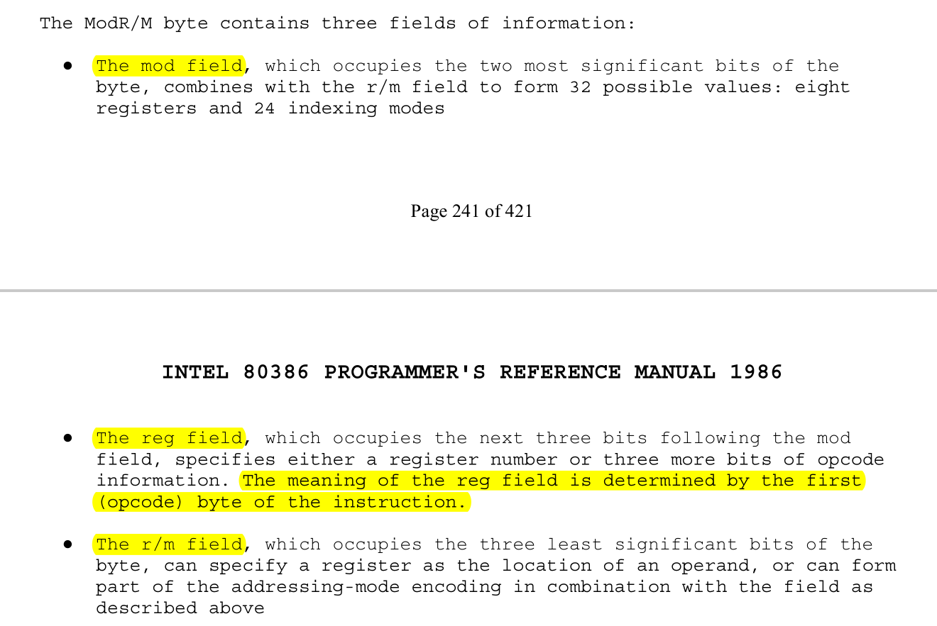 P241-243页。ModR/M 由 Mod,Reg/Opcode,R/M 三个部分组成。 Mod 是前两位,提供寄存器寻址和内存寻址, Reg/Opcode为3-5位,如果是Reg表示使用哪个寄存器,Opcode表示对group属性的Opcode进行补充; R/M为6-8位,与mod结合起来会得到8个寄存器和24个内存寻址。