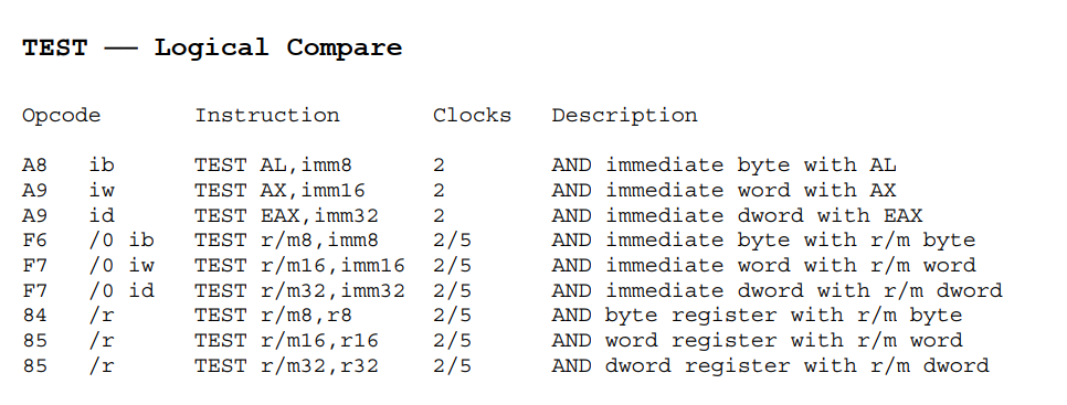 test指令其实相当于进行AND按位与操作,但是test是不会改变操作数的,只会改变EFLAGS寄存器中的标志位。