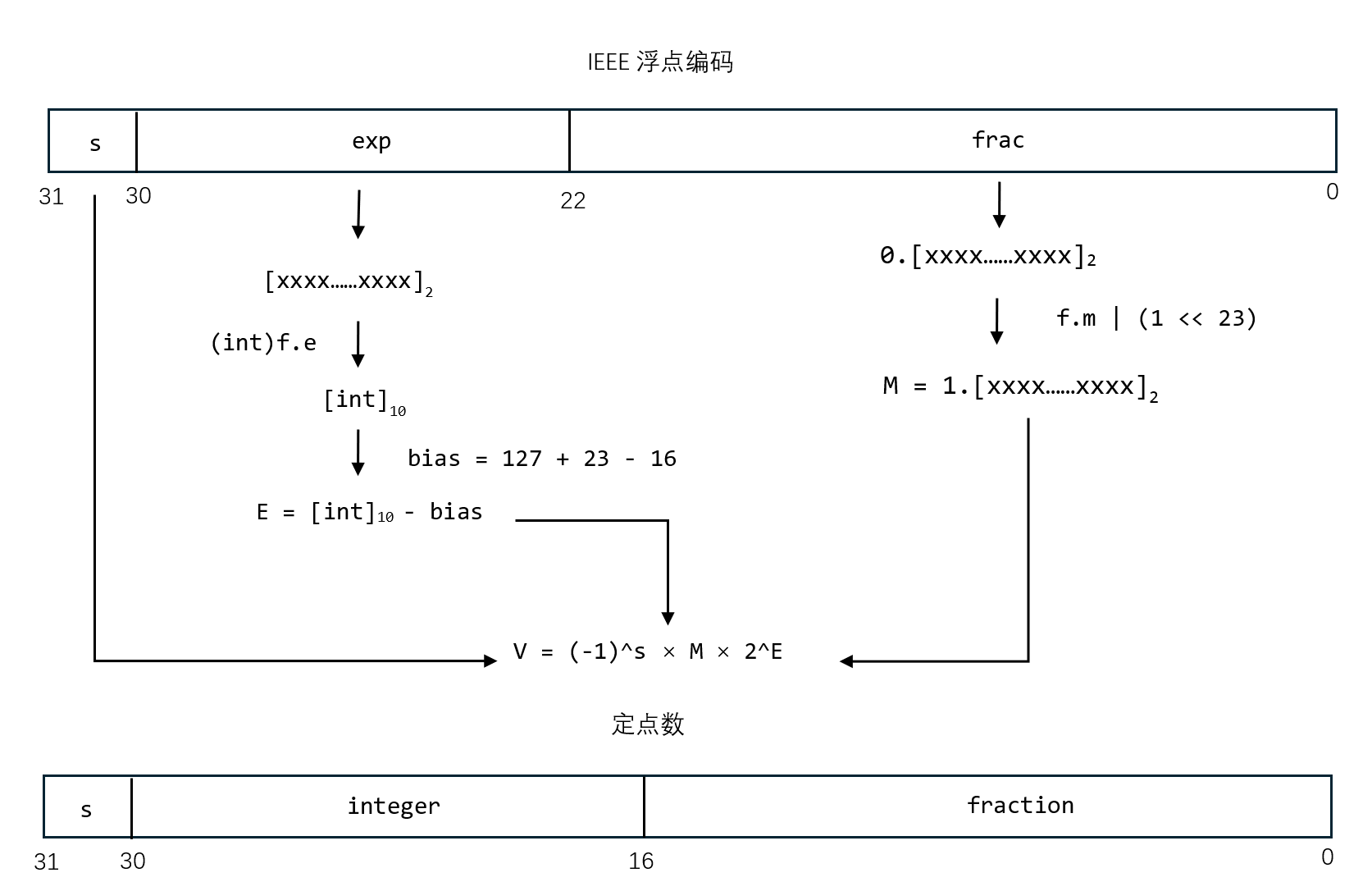 回忆浮点数的计算公式:对于一段32位长的浮点数编码,它对应的浮点数值为:$V = (-1)^s \times M \times 2^E$