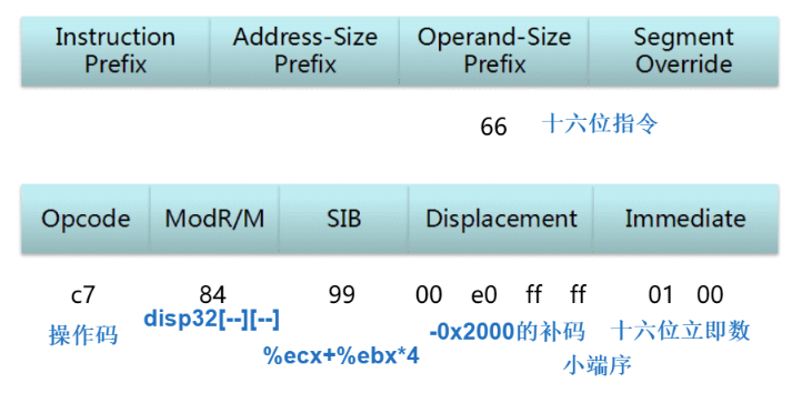 Opcode(操作码)必定出现,其余组成部分可能不出现。Opcode决定是否出现ModR/M;SIB、Displacement、Immediate由ModR/M决定。- 对于某些组成部分,其长度并不是固定的。