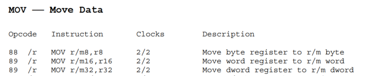 | Opcode | 88表示这条指令的opcode的首字节是0x88,/r表示后面跟一个ModR/M字节,并且 ModR/M字节中的reg/opcode域解释成通用寄存器的编码。 |