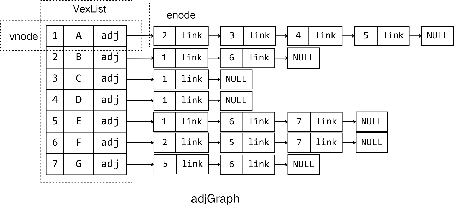- 用邻接表表示无向图时,需要 $n$ 个顶点结点,$2e$ 个边结点;