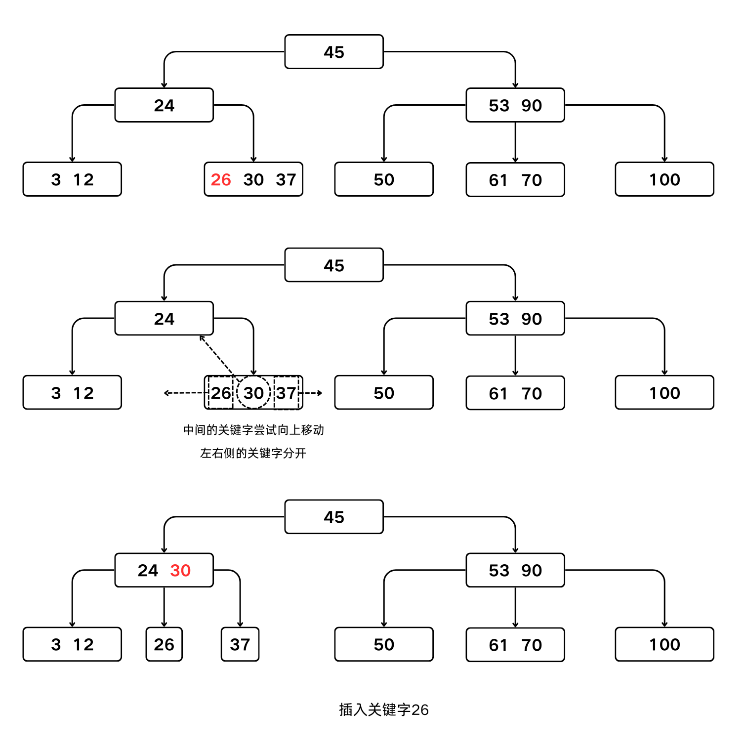 - 每次插入一个关键字不是在树中添加一个叶子结点,而是在查找的过程中找到叶子结点所在层的上一层;