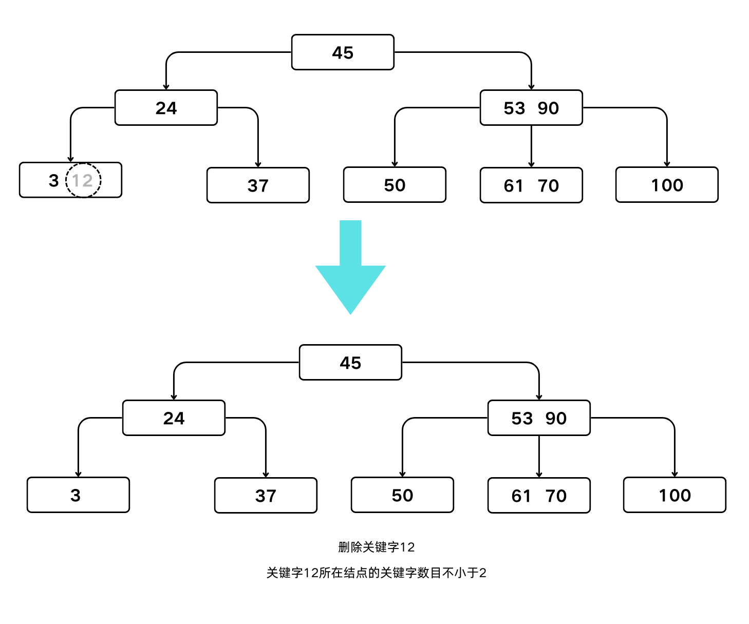 - 若删除后使双亲结点中的关键字数目小于 $\lceil m/2 \rceil –1$,则依此类推层层向上合并。
