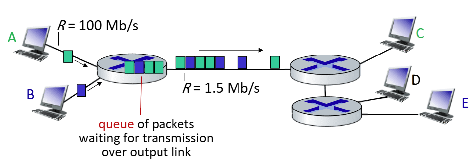 排队与丢包:如果一段时间内到达链路的速率超过链路的传输速率,则数据包将会在路由器上的缓冲区排队。若缓冲区已满,多余的数据包则可能被丢弃,称为丢包。