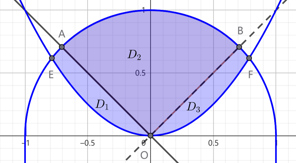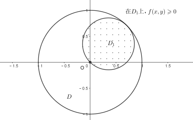 故单位圆 $D: x^2+y^2 \leqslant 1$ 被分成两部分:$D_1=\{(x,y)| f(x,y) \geqslant 0 \}, D_2=D-D_1$,因此