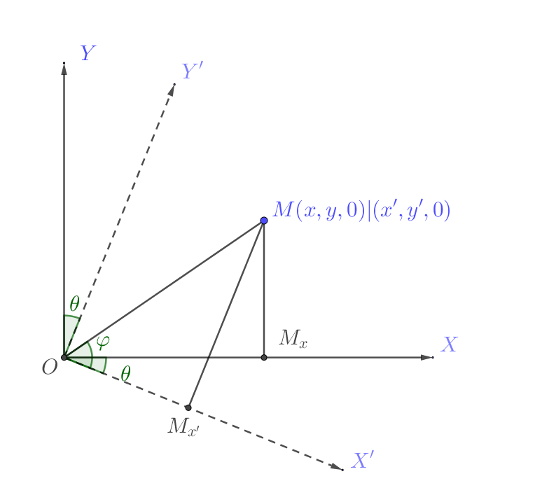 $$\begin{align*} & \left\{ \begin{array}{c} x = OM_x = OM \cos \angle MOM_x = OM \cos(\varphi-\theta) \\ y = MM_x = OM \sin \angle MOM_x = OM \sin(\varphi-\theta) \end{array} \right. \tag{1} \\ \\ & \left\{ \begin{array}{c} x' = OM_{x'} = OM \cos \angle MOM_{x'} = OM \cos\varphi \\ y' = MM_{x'} = OM \sin \angle MOM_{x'} = OM \sin\varphi \end{array} \right. \tag{2} \end{align*}$$把(1)式按照三角函数展开得: